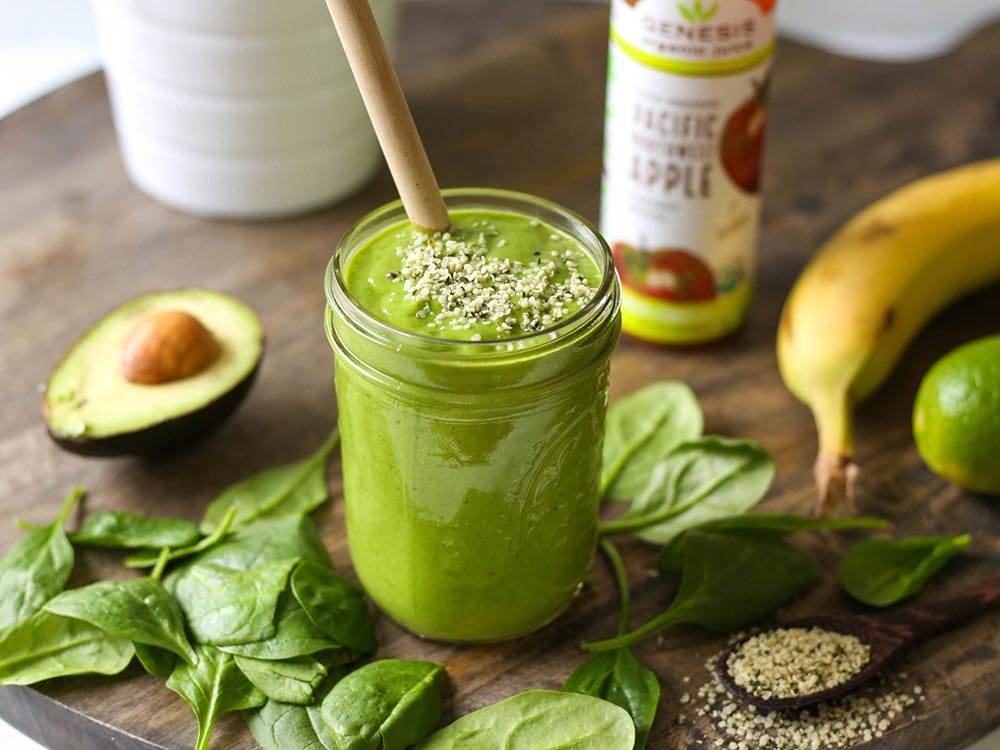 Add banana, Genesis PNW Apple Juice, avocado, spinach, kale, pineapple, mango, ginger, and cucumber to a blender. Blend until smooth.