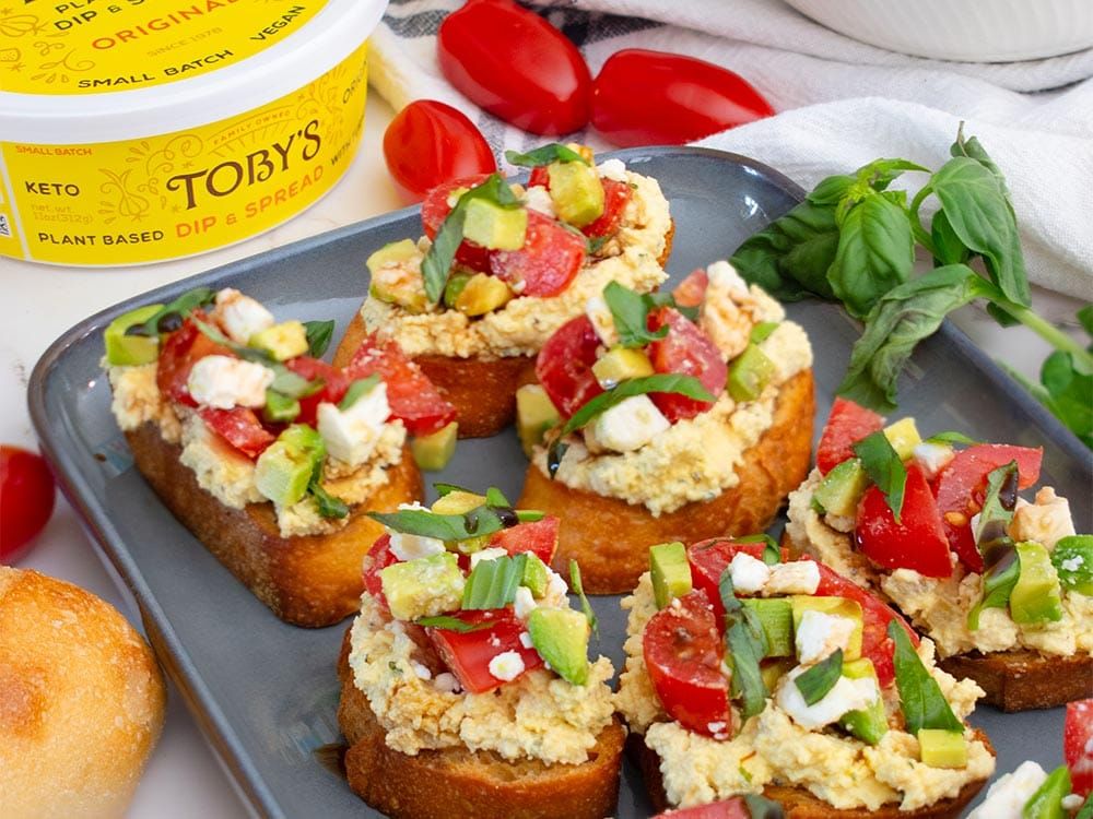 Spread a serving of Toby’s Original Dip & Spread on each toasted slice. In a medium bowl, combine cherry tomatoes, avocado, feta cheese crumbles, and a tsp of olive oil. Toss until combined, then carefully spoon the mixture onto the baguette slices.