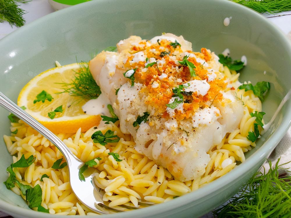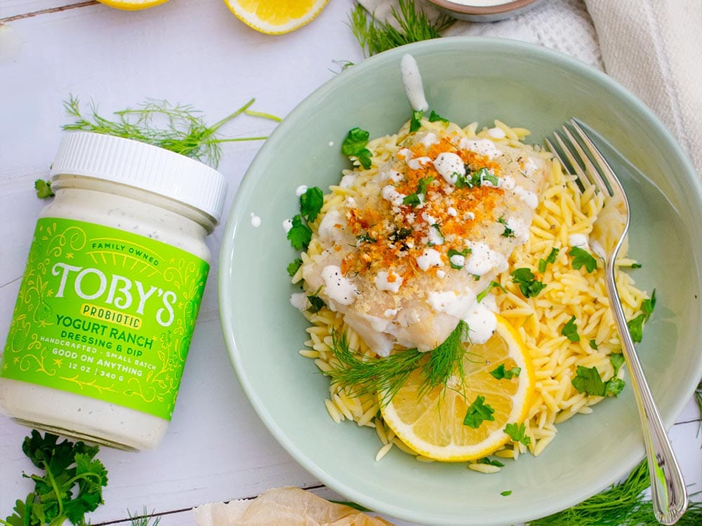 Add a bed of orzo to four bowls and top with baked fish filet drizzled with Toby’s Yogurt Ranch Dressing & Dip, more fresh herbs, and salt & pepper to taste. Serve with lemon slices and enjoy your Baked White Fish!
