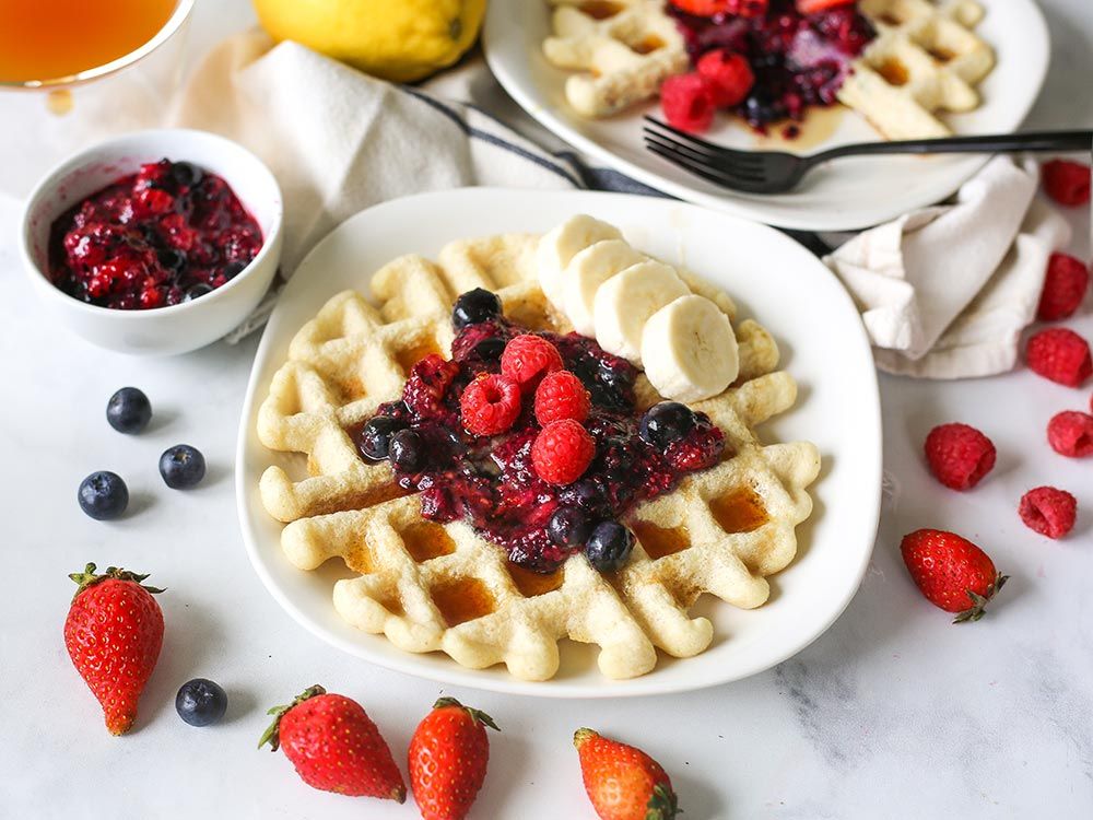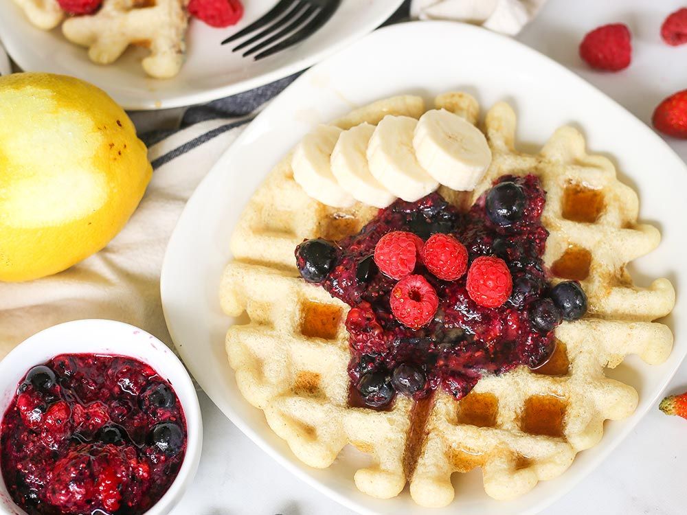 Add waffles to a plate. Top with homemade compote, slices of banana, and a drizzle of maple syrup.