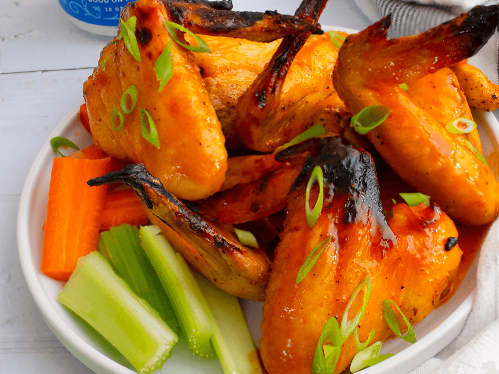 Coat with honey buffalo sauce mixture and bake again for 10 more minutes until slightly charred and sticky. Plate with carrot and celery sticks and sprinkle with fresh chives.