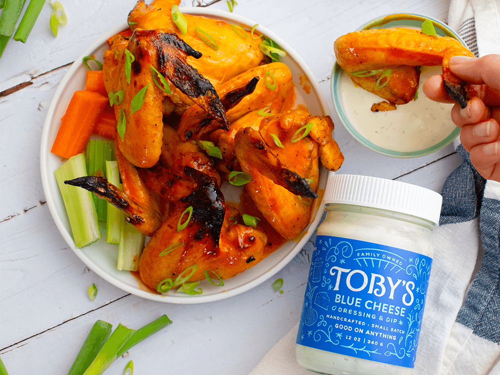 Serve with a ramekin of Toby’s Blue Cheese Dressing & Dip and enjoy your Honey Buffalo Chicken Wings!