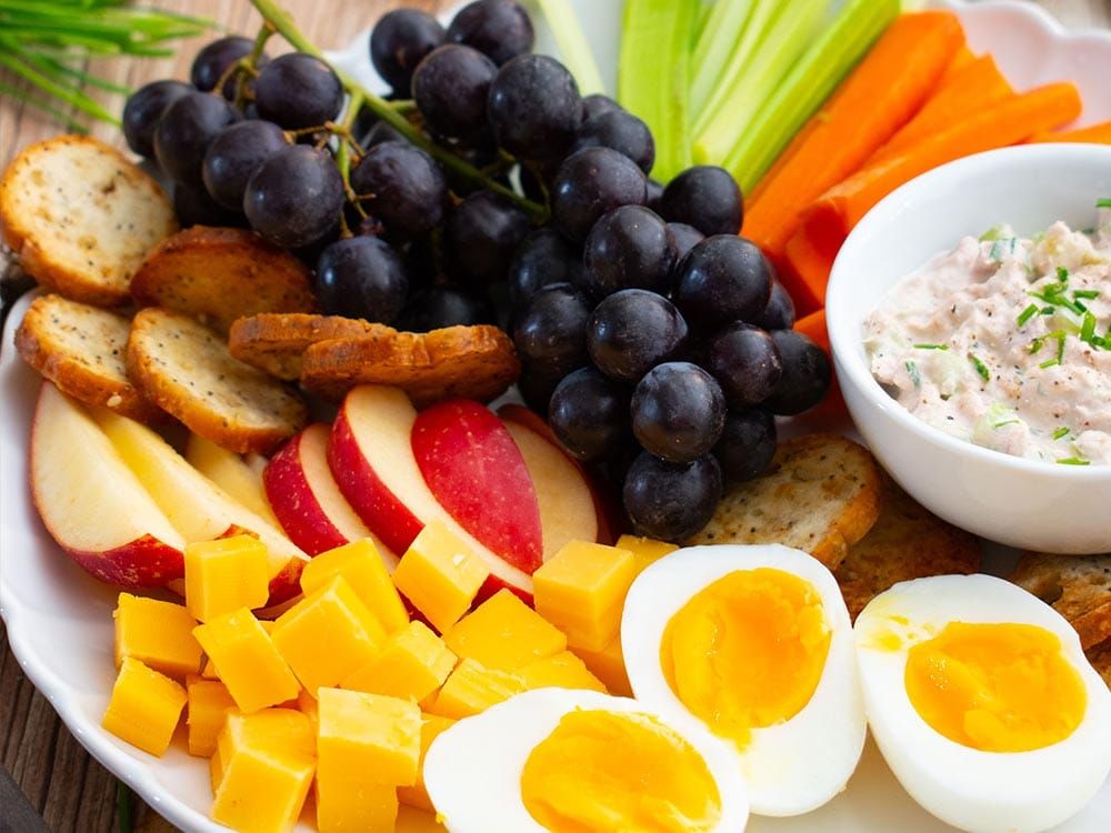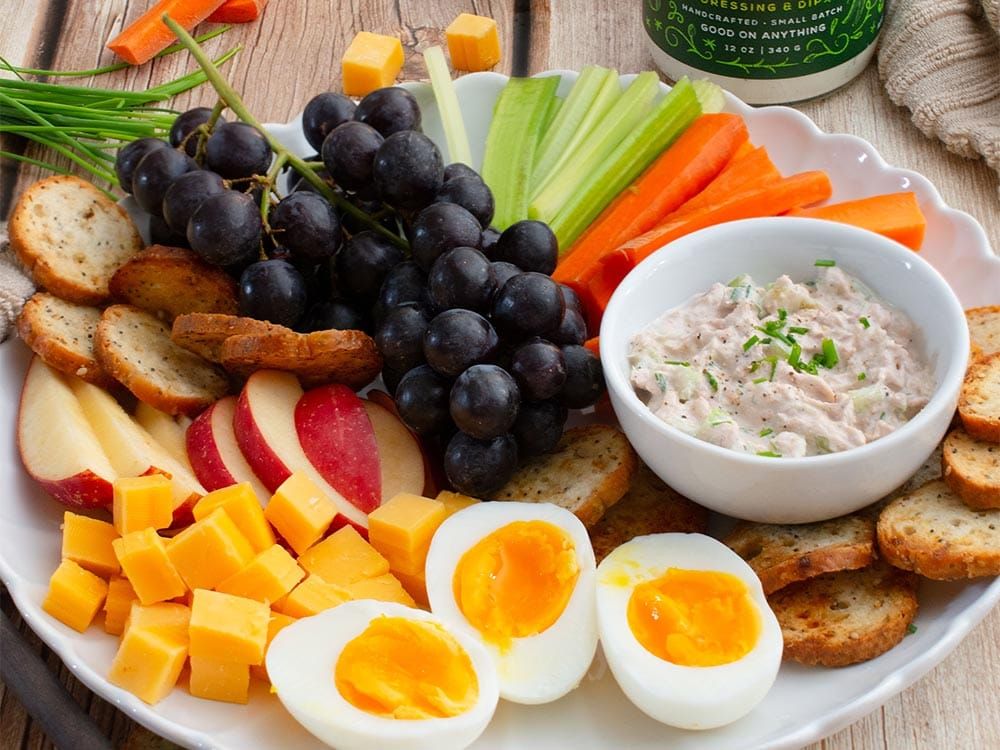 Plate the tuna spread and arrange carrot sticks, celery sticks, red grapes, bread chips, apple slices, cheddar cheese, and boiled eggs around it.