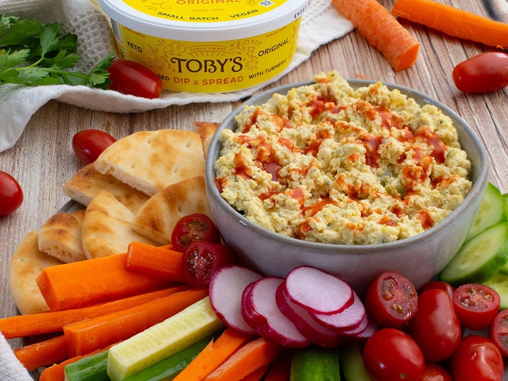 Gather all ingredients. Add a small bowl and fill with Toby’s Original Dip & Spread. Drizzle over with Frank’s Hot Sauce. Place the bowl on a platter and arrange cucumber, grape tomatoes, carrots, radishes, and pita dippers around it. Serve and enjoy your Quick Easy Snack Plate!