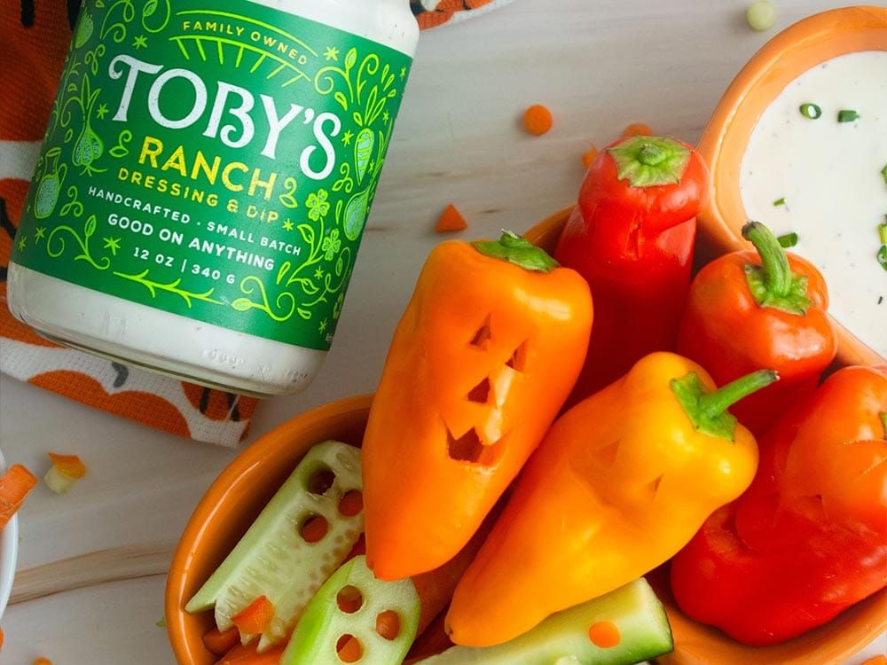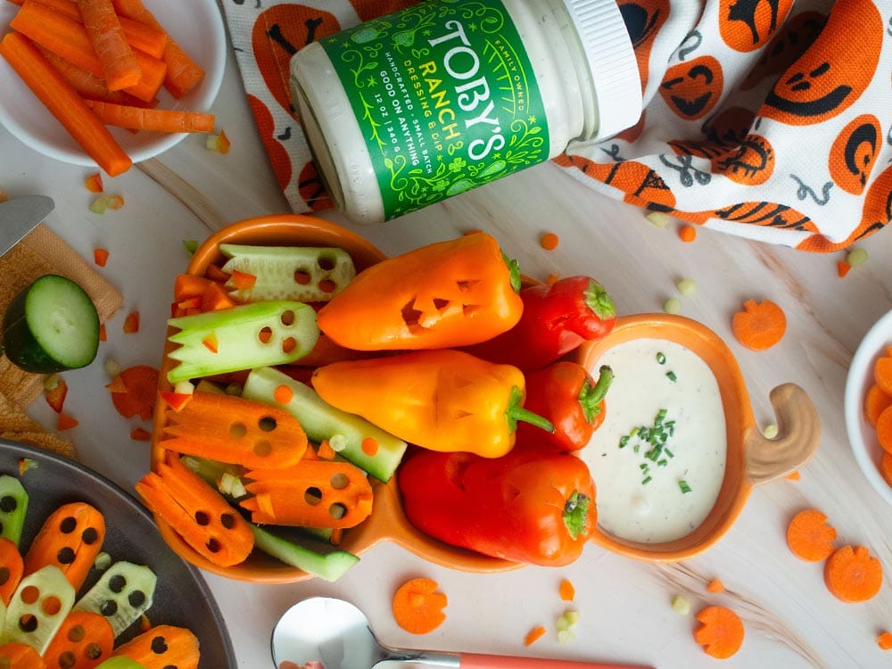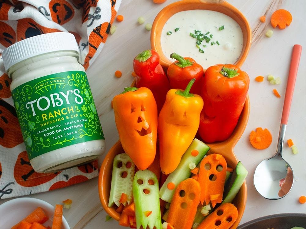 In a seasonal dish, arrange jack-o-peppers, cucumber and carrot sticks, and veggie ghosts. Fill in a pocket with Toby’s Ranch Dressing & Dip, or serve in a ramekin on the side. Sprinkle platter with saved scraps for fun veg-fetti! Enjoy your Spooky Snack Plate!