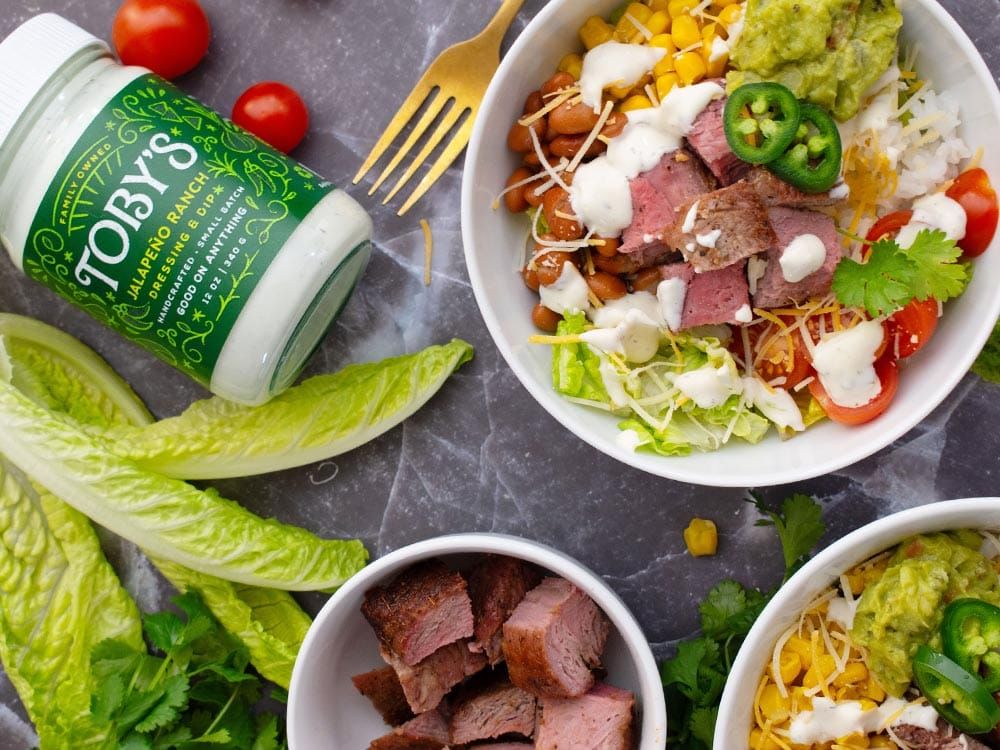 Meanwhile, prepare 2-4 bowls. Divide the rice and romaine, then add corn, pinto beans, cherry tomatoes, and colby jack cheese. Drizzle with Toby’s Jalapeño Ranch Dressing & Dip and add a dollop of guacamole to the side. Chop up the steak into bite sized pieces, and add to the bowl. Garnish with sliced jalapenos and cilantro. Serve and enjoy your Steak Burrito Bowl!