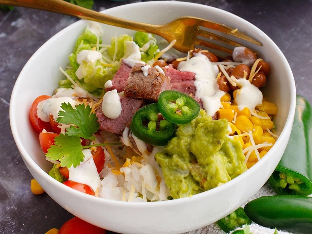 Steak Burrito Bowl with Jalapeño Ranch Dressing