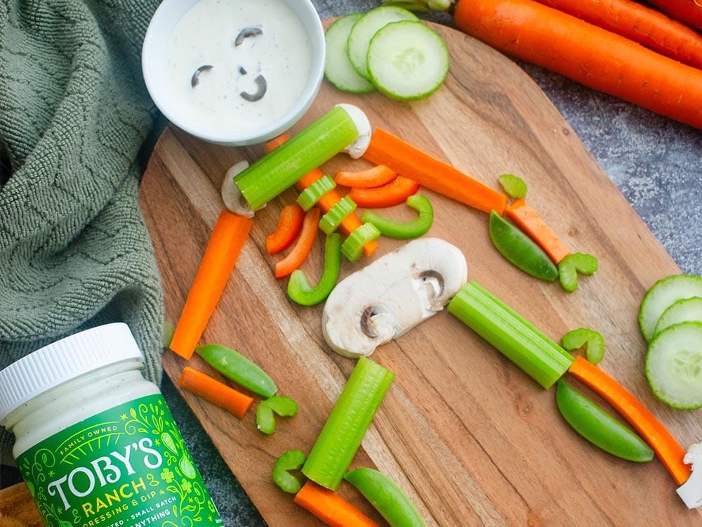 Gather all ingredients. On a medium serving board, place a ramekin of Toby’s Ranch Dressing & Dip at the top for the head. Arrange carrot sticks for the spine, arms, and shins. Use mushrooms for shoulders and pelvis. Celery for the collar bone, thighs, and smaller slices for the spine, hands, elbows, and knees. Snap peas for the forearms and calves. Bell pepper slices for the rib cage. Cauliflower for the feet. Lastly, create the face using sliced olives and arrange cucumber slices for extra veggies. Serve and enjoy your Veggie Skeleton Board!