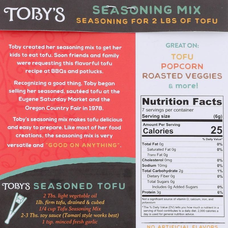 Toby created this seasoning mix back in the ’70s to get her kids to eat sautéed tofu. They loved it and soon friends and family started clamoring for it too. Before long, Toby was selling her mix and her famous “Tofu Tia” tacos at grower’s markets and fairs, and Toby’s Family Foods was born.